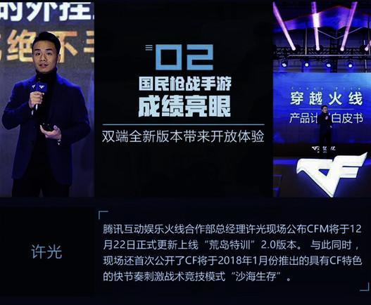 12月21日,騰訊旗下國民槍戰(zhàn)游戲穿越火線在深圳海上世界藝術(shù)中心召開了戰(zhàn)略發(fā)布會(huì)。現(xiàn)場(chǎng)更是發(fā)布了關(guān)于CF荒島特訓(xùn)2.0版本后的戰(zhàn)術(shù)競(jìng)技玩法,并且跨界肯德基和順豐合作將成為最大亮點(diǎn)。