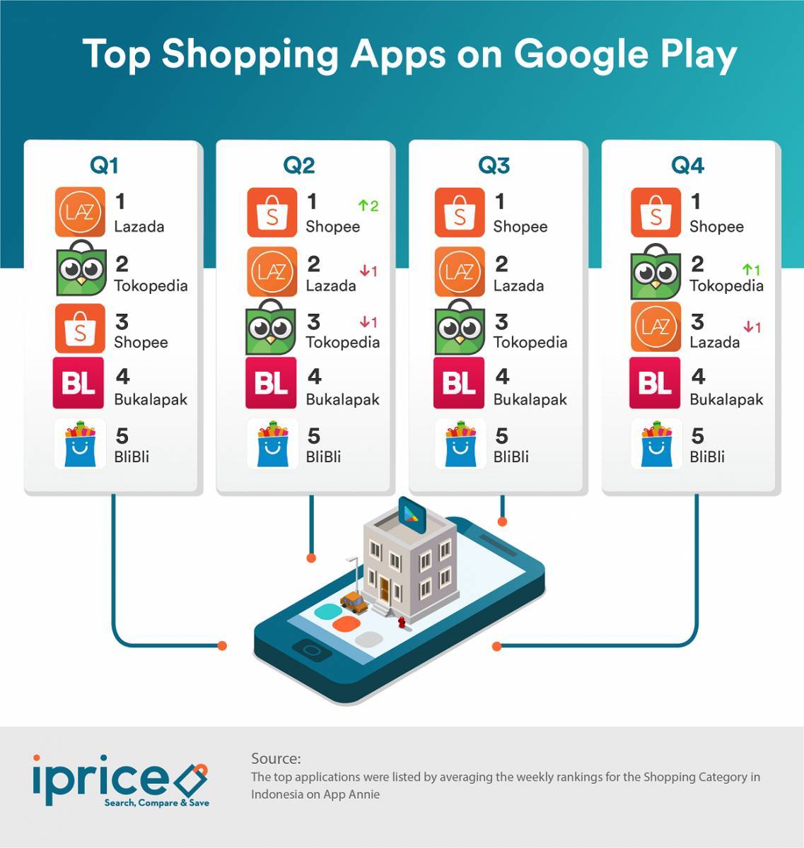 Lazada和Tokopedia總是位居前兩名,這一數據和谷歌趨勢的數據相一致;Bukalapak穩定在三、四名,Blibli緊隨其后;后期,shopee躍居第5,Zalora擠進前10。