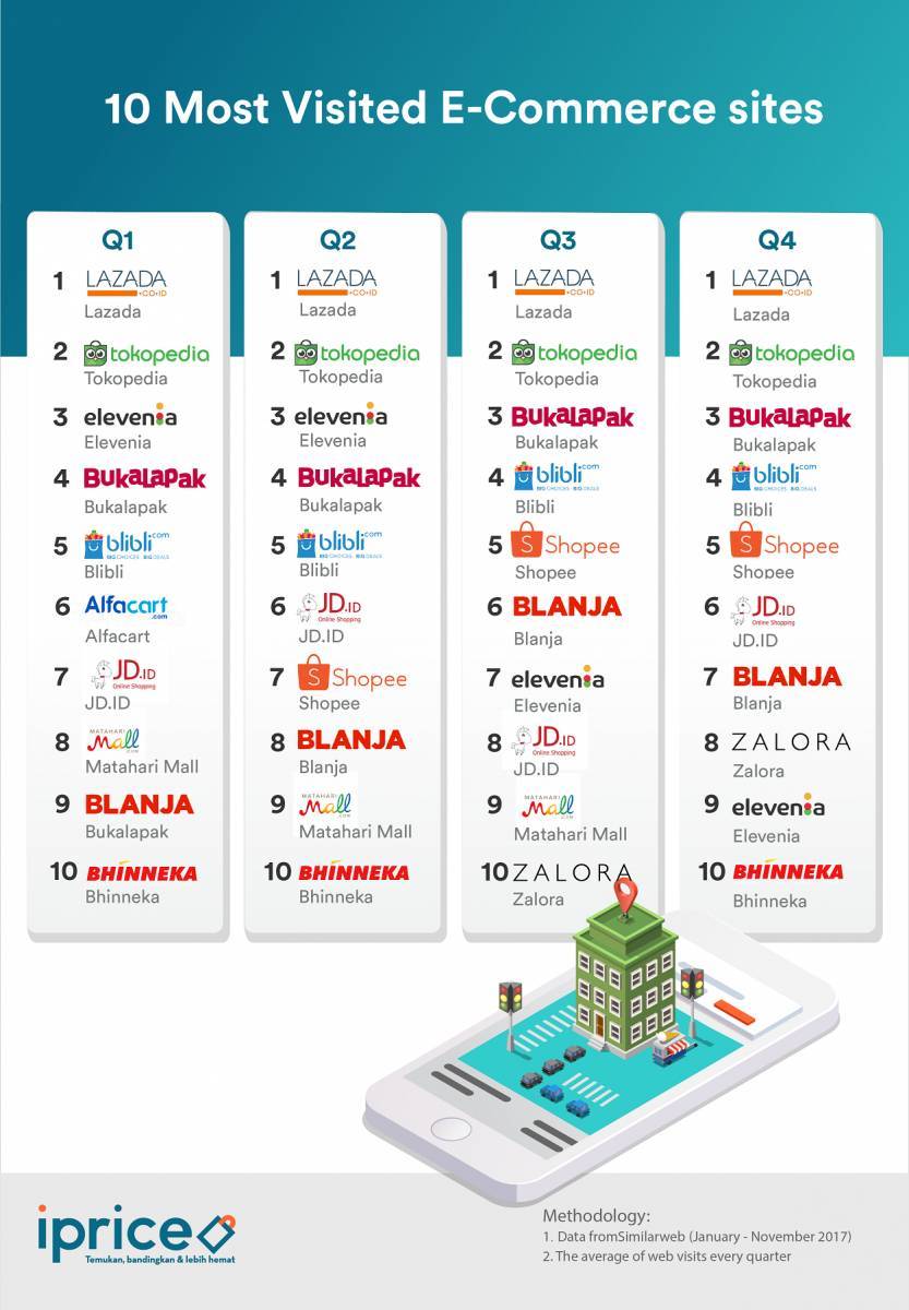iPrice根據similarweb2017年1-11月的數據,列出了各季度印尼訪問量最高的前十電商網站。發現: