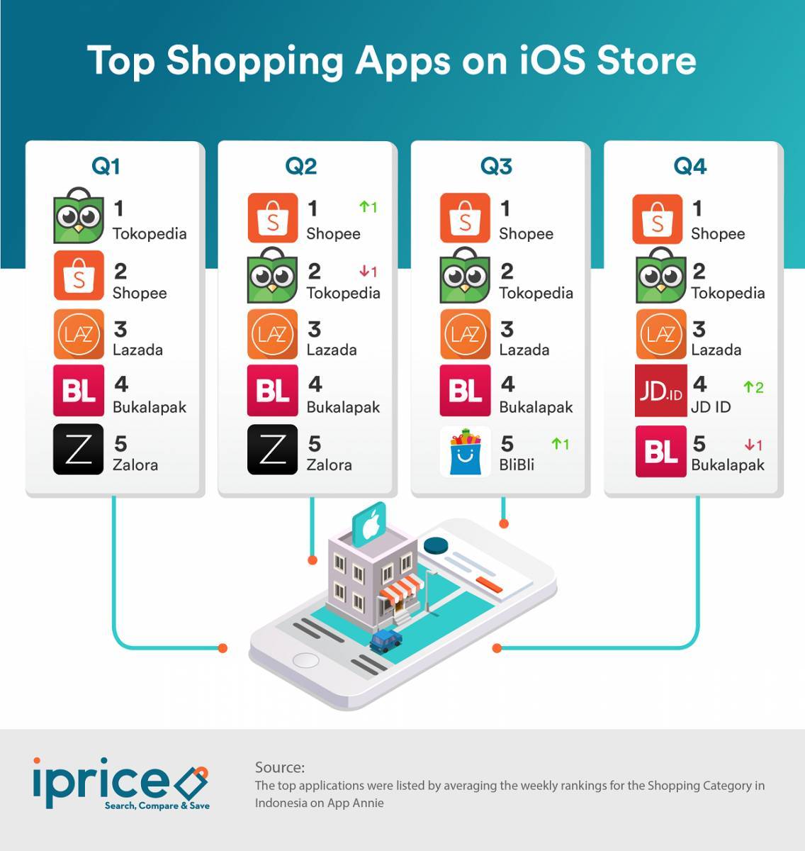 shopee主導移動購物。總體而言,不論是GP還是IOS,shopee位列第一。這可能是得益于shopee在印尼上線之際就把自己打造成移動C2C在線交易市場。