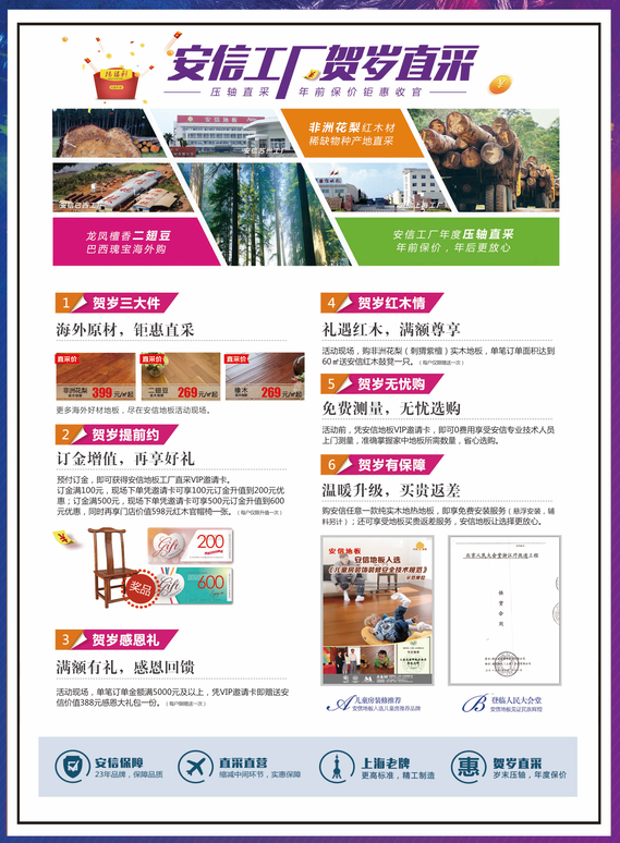 據(jù)了解,此次工廠直采節(jié)活動中,不僅有深受用戶喜愛的二翅豆實木地板等爆款產(chǎn)品外,還有6大驚喜福利大禮包,讓買的更舒心更實惠。賀歲三大件:海外原料,鉅惠直采,非洲花梨、二翅豆、橡木等工廠直銷,更加優(yōu)惠,賀歲提前約:訂金增值,再享好禮,預(yù)付定金,你就是我們安信地板的VIP用戶,可獲得工廠直采VIP邀請卡,同時還有機會獲得紅木官帽椅。賀歲感恩禮:活動現(xiàn)場下單,單筆訂單金額滿5000元及以上,憑VIP邀請券贈送388元感恩大禮包;賀歲紅木情:禮遇好禮,滿額尊享,在活動現(xiàn)場,購非洲花梨(刺猬紫檀)實木地板,單筆訂單面積達到60㎡送紅木鼓凳一只;賀歲無憂購:免費測量,無憂選購,活動前,憑安信地板VIP邀請卡,即可享受0元上門測量,省心選購。賀歲有保障,溫暖升級,買貴返差,購買安信任意一款純實木地熱地板,即享受懸浮免費安裝服務(wù),同時還享受地板買貴返差服務(wù),讓您放心選購。\u00A0