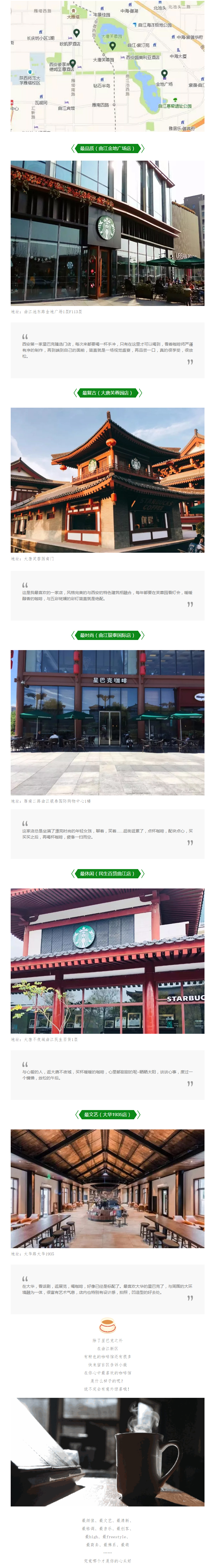 星巴克的西安情緣始于2006年11月23日,西安第一家星巴克在高新世紀(jì)金花購(gòu)物中心開(kāi)業(yè),全城轟動(dòng)。在短短十年里,美人魚(yú)的標(biāo)志一點(diǎn)一點(diǎn)插在古城的版圖之上,星巴克開(kāi)始了在西安擴(kuò)張的步伐,越來(lái)越多的星巴克咖啡店出現(xiàn)在這座文化古城,它的香醇馥郁開(kāi)始縈繞在西安的大街小巷,歷史文化與咖啡在這座古城里碰撞,融合。