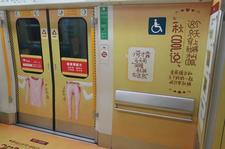 近日,北京地鐵四號(hào)線地鐵部分列車(chē)被溫暖的淡黃色裝飾一新,號(hào)稱(chēng)“秋褲號(hào)”的地鐵車(chē)廂令人眼前一亮。仔細(xì)觀察不難發(fā)現(xiàn),列車(chē)的車(chē)廂內(nèi)布滿了關(guān)于秋褲的各種版本的手繪漫畫(huà)及幽默逗趣的文案。這些走心的設(shè)計(jì),為昔日沉悶的車(chē)廂增添了一抹歡快的氛圍,引得乘客紛紛駐足留念。