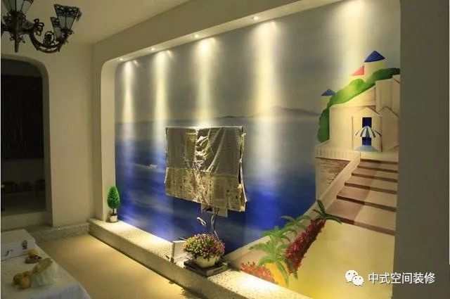 手繪背景墻漂亮吧,請專業(yè)的手繪師傅畫的,碧海藍(lán)天海景房,搭配上馬賽克的地臺很似漂亮,越看越喜歡。