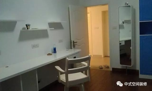 書房兼衣帽間,進(jìn)門邊上買了個穿衣鏡擺放著,其他基礎(chǔ)裝修都一樣,大白墻,木地板。
