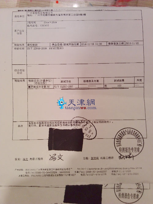 隨后記者聯(lián)系了東方購(gòu)物廣場(chǎng)辦公室羅經(jīng)理。據(jù)記錄,張先生是2016年7月30日,商場(chǎng)內(nèi)購(gòu)會(huì)期間購(gòu)買的富鋌T恤。“8月2日顧客來(lái)到商場(chǎng)柜臺(tái),洗過(guò)的T恤說(shuō)袖子上掉毛!绷_經(jīng)理說(shuō),“全棉的東西,裁剪的過(guò)程中難免有掉毛情況。我們也和公司進(jìn)行協(xié)商,8月4日15點(diǎn)11分我們收到了國(guó)家紡織品服裝服飾產(chǎn)品質(zhì)量監(jiān)督檢驗(yàn)中心(廣州)的質(zhì)檢報(bào)告。因?yàn)轭櫩唾?gòu)買的是老款,所以發(fā)過(guò)來(lái)的是2014年T恤面料的質(zhì)檢報(bào)告,質(zhì)檢報(bào)告完全合格,產(chǎn)品質(zhì)量沒有問(wèn)題。8月5日我們致電顧客,但電話并未接通。直至15日顧客才來(lái)商場(chǎng)對(duì)質(zhì)檢報(bào)告進(jìn)行拍照。”