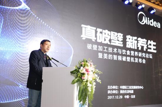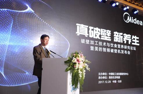 2017年12月29日,由中國輕工業(yè)發(fā)展研究中心主辦、美的生活電器承辦的“真破壁新養(yǎng)生”破壁加工技術(shù)與飲食營養(yǎng)研究論壇暨美的智頻破壁機(jī)發(fā)布會(huì)在北京新云南皇冠假日酒店隆重召開,中國工程院院士孫寶國、中國輕工業(yè)發(fā)展研究中心主任陳建國、中國家用電器研究院副院長(zhǎng)馬德軍、中國家用電器協(xié)會(huì)秘書長(zhǎng)朱軍、中國標(biāo)準(zhǔn)化研究院感官分析研究室主任趙鐳、江南大學(xué)食品科學(xué)與技術(shù)國家重點(diǎn)實(shí)驗(yàn)室教授陳潔、中國農(nóng)業(yè)大學(xué)食品科學(xué)與營養(yǎng)工程學(xué)院教授沈群、華中農(nóng)業(yè)大學(xué)食品科技學(xué)院教授趙思明、美的生活電器事業(yè)部國內(nèi)營銷總經(jīng)理廖潤(rùn)菲、美的生活電器事業(yè)部首席產(chǎn)品經(jīng)理韓翰、美的生活電器事業(yè)部研究院院長(zhǎng)陳煒杰等領(lǐng)導(dǎo)、專家、學(xué)者共同出席了本次會(huì)議。