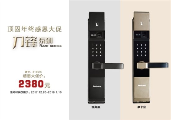 年關(guān)將至,人們沉浸在買買買的狂歡中,但最后很多東西都放在角落里吃灰,而每天都在用的那把鎖才是最需要升級的。頂固年終感恩大促,刀鋒系列智能鎖新品上市,全國統(tǒng)一零售價3280元,年終感恩大促價只需2380元,活動時間僅限于2017年12月20日-2018年1月10日,活動結(jié)束立即恢復(fù)原價,趕緊到頂固五金全國各大專賣店搶購吧!