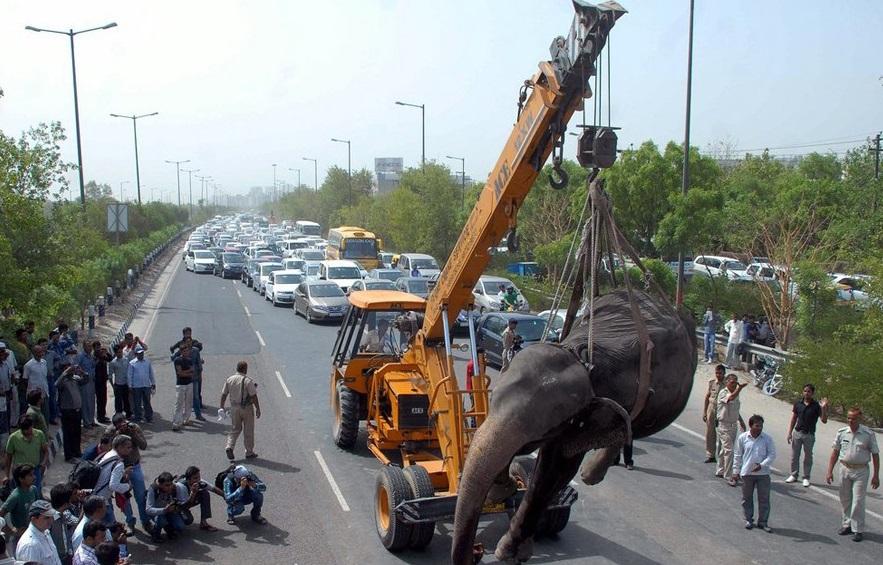 圖中起重機正在吊起死亡大象的尸體,重量約為4噸。