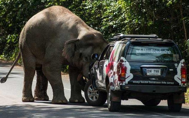 大象再大也畢竟是肉長的,在鋼鐵巨獸般的重卡面前還是不堪一擊。