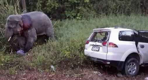 圖為一輛SUV失控并湊巧撞上了一頭未成年公象,公象負傷但仍能行走,而汽車完全報廢。