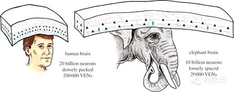 圖中左側(cè)文字:人類的大腦皮層中包含約200億個(gè)神經(jīng)細(xì)胞,其中包含20萬個(gè)錐體神經(jīng)元細(xì)胞,相對(duì)密集。圖中右側(cè)文字:大象的大腦皮層中包含約100億個(gè)神經(jīng)細(xì)胞,其中包含2萬個(gè)錐體神經(jīng)元細(xì)胞,相對(duì)稀疏。