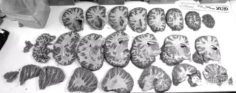 我把放在兩個(gè)L型支架里的大象腦半球平放于試驗(yàn)臺(tái)上。我的一個(gè)學(xué)生按照我的要求拿著支架,而我則用左手扶住象腦,用右手輕柔卻堅(jiān)定地來回切割。切割幾次后,刀片就到達(dá)了大腦的后半部及小腦處,然后,我們就能看到一排面包片似的大象腦切片各自平攤在試驗(yàn)臺(tái)上。其中包括:16個(gè)大腦皮層切片、8個(gè)小腦切片,此外還有整個(gè)腦干部分和巨大的、重達(dá)20克的嗅球部分(非洲象腦嗅球的質(zhì)量是鼠嗅球的10倍)。
