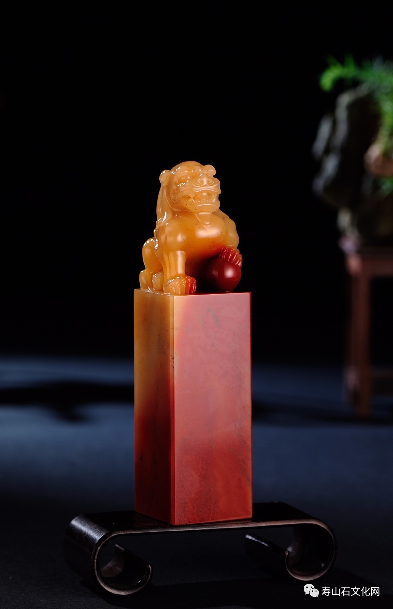 雕刻名手陳為新先生相信大家也很熟悉啦,他是潘驚石的高徒,擅長(zhǎng)動(dòng)物、印鈕,尤以古獸見長(zhǎng)。這件陳為新所作的高山石瑞獸戲珠鈕方章也相當(dāng)精彩,選用材質(zhì)為高山石,章體色澤濃艷富麗,作者將鈕頭雕刻為一只獅子,昂首挺立,抬視蒼穹,富有堂皇莊嚴(yán)氣象,其左足攀住靈珠,姿態(tài)矯健靈活,如傲視群類,又盡顯活潑生動(dòng)的神采,威嚴(yán)吉祥的形象呼之欲出。