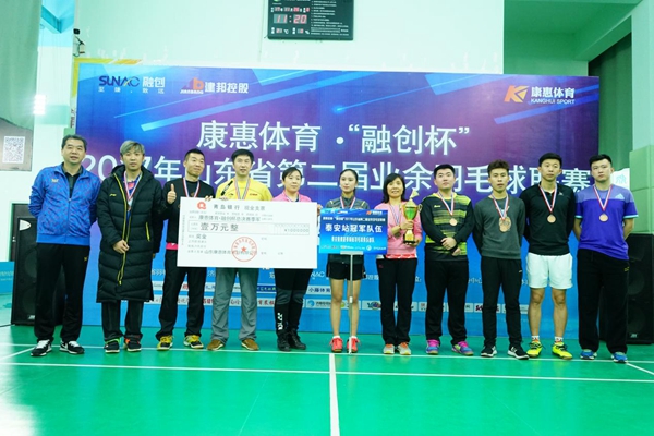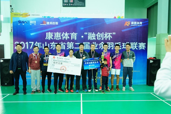 2017年11月26日,康惠體育?“融創(chuàng)杯”2017年山東省第二屆業(yè)余羽毛球聯(lián)賽總決賽在濟(jì)南市全民健身中心圓滿收官。本次總決賽由山東省羽毛球運(yùn)動(dòng)協(xié)會(huì)、濟(jì)南市體育局主辦,濟(jì)南市全民健身中心、山東康惠體育策劃有限公司承辦,濟(jì)南小騰體育俱樂部、山東康惠羽毛球俱樂部、上汽通用凱迪拉克品牌、蘇酒體育(洋河股份)、山東互聯(lián)網(wǎng)傳媒集團(tuán)、山東開創(chuàng)集團(tuán)股份有限公司、北京羽動(dòng)體育文化有限公司協(xié)辦。來自全省17地市分站賽的冠軍隊(duì)伍齊聚濟(jì)南,同臺(tái)競(jìng)技。最后,青島百富集團(tuán)隊(duì)、威海大元華一隊(duì)、泰安康健豪泰鋼板羽毛球俱樂部、濟(jì)南暴風(fēng)羽隊(duì)分獲冠、亞、季、第四名。