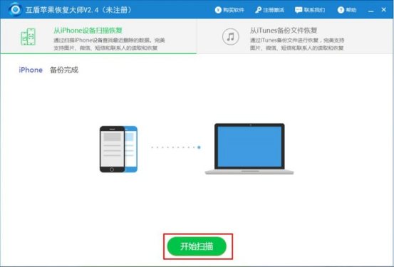 第二步:接著就可以將軟件打開了,打開后兩種掃描方式中選擇一種掃描方式,這里選擇“從iphone設(shè)備掃描恢復(fù)”按鈕,這樣軟件就開始對手機里的信息進行掃描了。