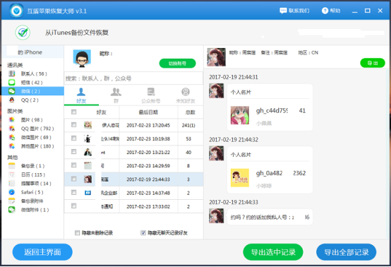 第四步:最后點擊出現(xiàn)界面左側(cè)的“微信”按鈕,看到自己要恢復(fù)的聊天記錄進行勾選,選擇好后點擊”恢復(fù)選中記錄”按鈕。