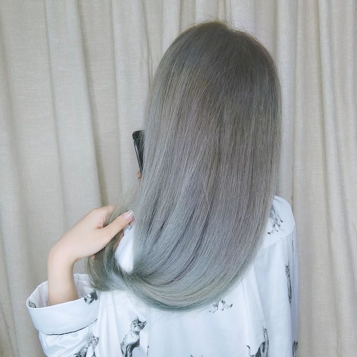 洗完之后就是這樣,會變成灰色。發(fā)尾最死的地方最上色,會變成灰紫色。