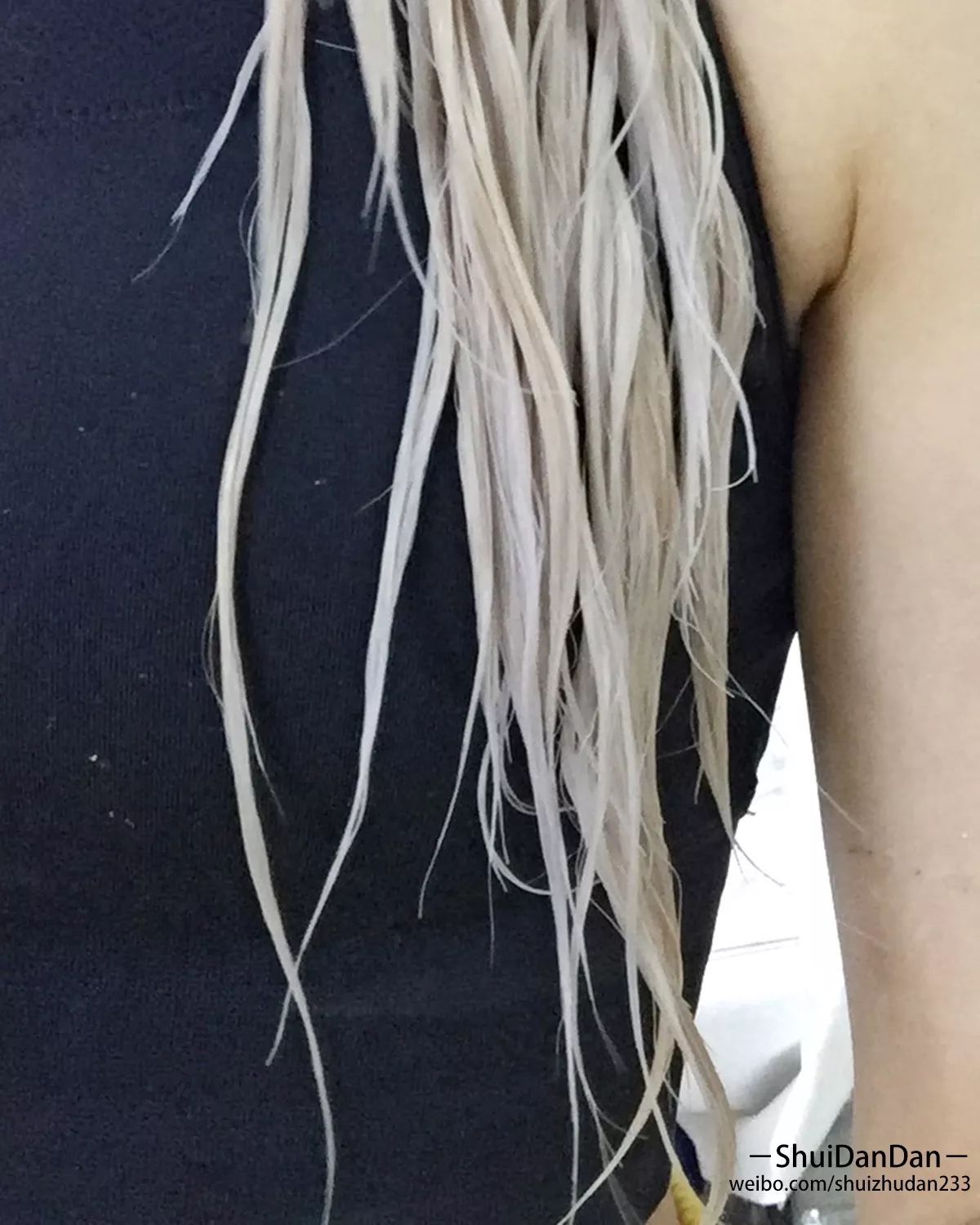 順便解釋一下魷魚絲米粉頭,沒有漂染到這個程度的人可能不知道,漂染到最后的頭發(fā),濕了之后是可以像米粉一樣一掐就斷的。我給我朋友們都演示過,她們覺得很不可思議hhhhh