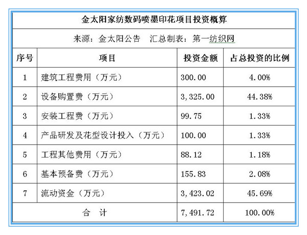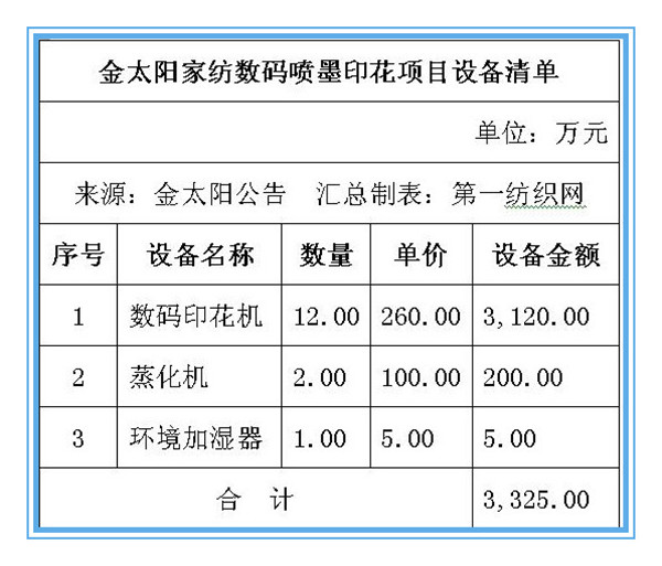 金太陽家紡數(shù)碼噴墨印花項目計劃新增設(shè)備3,325.00萬元,本項目設(shè)備清單如下: