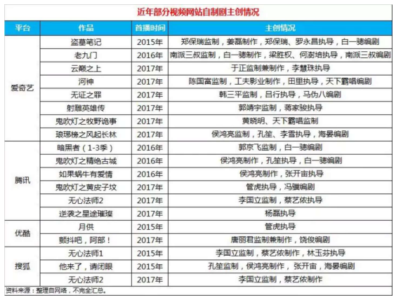 通過上圖可知,三家已公開主創(chuàng)信息的自制劇中都出現(xiàn)了電影級別主創(chuàng)的身影,如騰訊的《鬼吹燈之怒晴湘西》由管虎執(zhí)導(dǎo),《香港華爾街》由劉德華監(jiān)制、黃國強執(zhí)導(dǎo),優(yōu)酷的《瘋?cè)嗽骸酚申惣紊媳O(jiān)制。