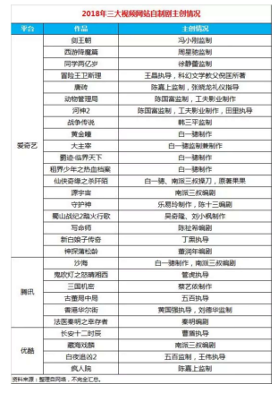 近期愛奇藝、騰訊、優(yōu)酷三大視頻網(wǎng)站紛紛公布2018年大劇片單,記者梳理出各家已公布主創(chuàng)陣容的自制劇情況,整理如下圖所示。