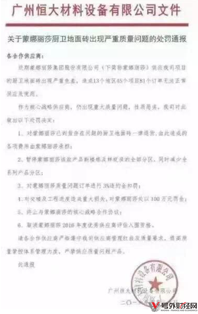 上述廣州恒大材料設(shè)備有限公司文件顯示:作為核心戰(zhàn)略供應(yīng)商,仍出現(xiàn)重大質(zhì)量問題,性質(zhì)惡劣,我司對此做出以下處罰決定:對蒙娜麗莎已到貨存在問題的廚衛(wèi)地面磚一律退貨,由此造成的各項費用由蒙娜麗莎承擔(dān);暫停蒙娜麗莎該款產(chǎn)品新樓棟及樣板房的全部分區(qū),同時減少全系列產(chǎn)品分區(qū);對蒙娜麗莎質(zhì)量問題訂單進(jìn)行3%違約金扣罰;對交樓及工程進(jìn)度造成重大損失,對蒙娜麗莎處以100萬元罰金;終止與蒙娜麗莎的核心戰(zhàn)略合作協(xié)議;取消蒙娜麗莎2016年度優(yōu)秀供應(yīng)商評估入圍資格。