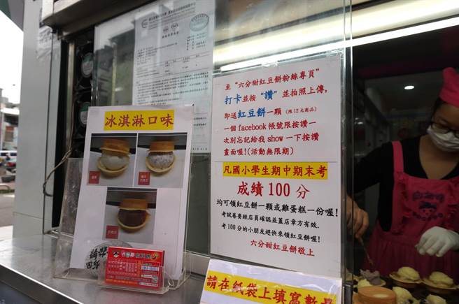 王艷君愛心大放送,國小學(xué)生考100分可以免費(fèi)獲得「六分甜」一顆紅豆餅或一份雞蛋糕獎勵。(盧金足攝)