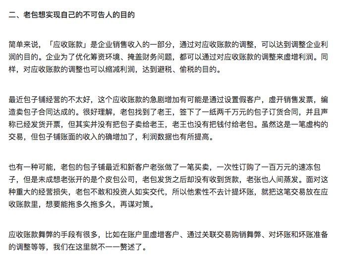 按照知乎知名財務(wù)回答者徐聞博對應(yīng)收賬款產(chǎn)生的可能性有三個通俗易懂的分析: