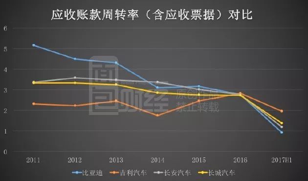 而對比同為自主品牌的吉利、長城以及長安汽車,比亞迪的應(yīng)收賬款周轉(zhuǎn)率也排名最低,17年上半年的0.93次,遠(yuǎn)低于排名第一吉利的1.95次。