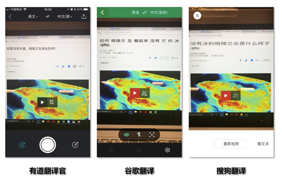 拍照翻譯,看人工智能黑科技如何“即拍即譯”第二局的口音大評測環(huán)節(jié),三款翻譯軟件都表現(xiàn)突出,翻譯得都比較準確。挑戰(zhàn)者演唱了一首 Lady Gaga 的 《Telephone》和說唱歌手 Eminem 的 《Lose yourself》開頭的幾句,Google 翻譯和有道翻譯官翻譯結(jié)果都不錯,而搜狗翻譯也同樣表現(xiàn)良好。直到第三局“拍照翻譯”環(huán)節(jié),再一次拉開實力的差距。主持人隨機挑選了BBC上一篇題為《How Greenland would look without its ice sheet》的新聞報道。