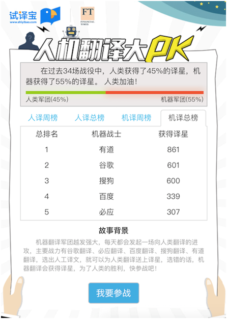 最終,憑借在對話翻譯、拍照翻譯中的出色表現(xiàn),有道翻譯官奪得此次人工智能翻譯大賽冠軍。而現(xiàn)場的不少觀眾也被比賽過程中各種精準的翻譯結(jié)果所折服,紛紛表示“簡直碾壓了我四級英語水平。”此前,由第三方翻譯評測機構(gòu)“試譯寶”發(fā)起的一場人機翻譯PK賽中,以有道翻譯領(lǐng)銜的機器翻譯軍團,以碾壓之態(tài)勝過人類翻譯軍團。“截止12月19日最新的結(jié)果,人類獲得32%譯星,機器獲得68%譯星。在機器軍團貢獻榜,有道獲得譯星最多,遠多于谷歌、百度、搜狗和必應(yīng)。(,獲得譯星越多,表明翻譯準確度越高;數(shù)據(jù)來源“試譯寶”)