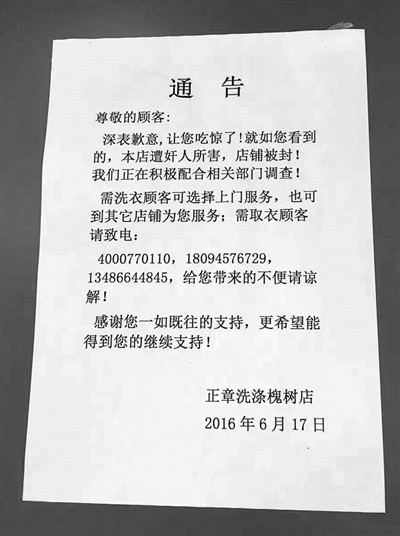 關于關門原因,有顧客去店里取衣服時,在緊閉的大門上發(fā)現(xiàn)一張說明告示,把人給直接嚇壞了――“讓您吃驚了!就如您看到的,本店遭奸人所害,店鋪被封……”
