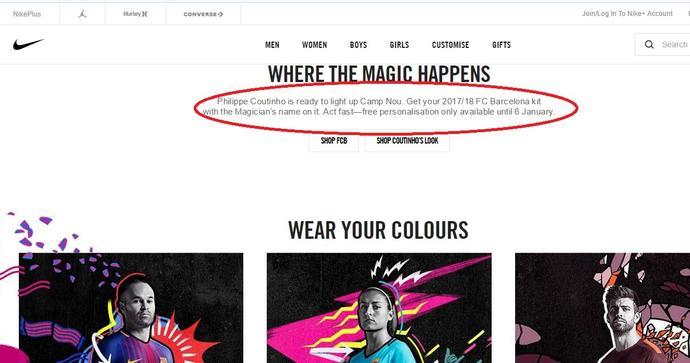 北京時間2017年12月31日,耐克的巴薩官方網上商城出現了“庫蒂尼奧即將加盟巴薩”的消息,還配上了這樣的字樣——“庫蒂尼奧即將閃耀諾坎普,請購買巴薩17-18賽季球衣,并且印上魔術師的名字。從1月6日開始,可以在官網購買。”