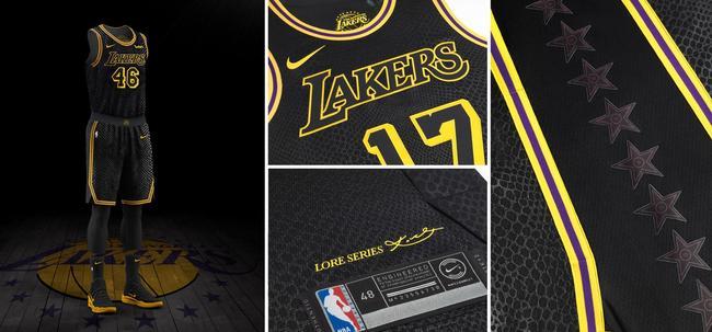 以湖人為例,科比·布萊恩特成為了第一個湖人城市版球衣設計靈感來源。該款球衣的采用了黑曼巴花紋,褲腰處印有湖人隊24號的號碼。球衣的側面印有16顆星,象征著湖人隊至今共贏得的16個NBA總冠軍,彰顯了湖人輝煌的傳統。
