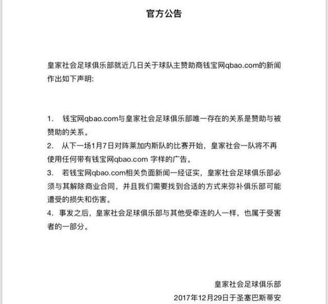 對此,皇家社會于北京時間2017年12月30日通過官方微博發(fā)布《關于錢寶網事件的官方公告》,澄清俱樂部與錢寶網的關系,并做出撤掉錢寶網廣告的決定。對于皇家社會而言,及時斷絕與涉嫌違法犯罪的贊助商之間的關系,以免產生過度牽連,無疑是明智之舉。