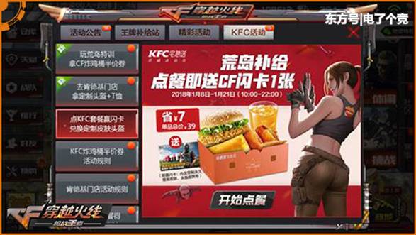 根據(jù)游戲里面的活動介紹,只要在規(guī)定的日期內(nèi),也就是1月7日至21日,只要我們玩一局CF吃雞手游,就有機會可以免費獲得“肯德基xCF炸雞桶半價券”,而且哦!只要奪得冠軍,就一定可以獲得!吃雞大神有福了!游戲內(nèi)外皆可吃雞!