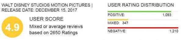 然而,電影公映之后,局勢卻發(fā)生了出人意料的逆轉(zhuǎn)。全美各地的星戰(zhàn)迷滿懷憧憬的走進電影院,但結(jié)束時卻面面相覷一臉懵。接著各大電影評分網(wǎng)站上,《星戰(zhàn)8》的觀眾評分開始雪崩般的下滑,同樣是在“爛番茄”網(wǎng)站,在光芒萬丈的影評人打分旁,網(wǎng)友觀眾給出不到60的分數(shù),格外刺眼。而觀眾評論里,褒貶評價的分布呈現(xiàn)出一個兩極分化的C形:好評和差評幾乎各占一半,一般的評價反而相對稀缺。