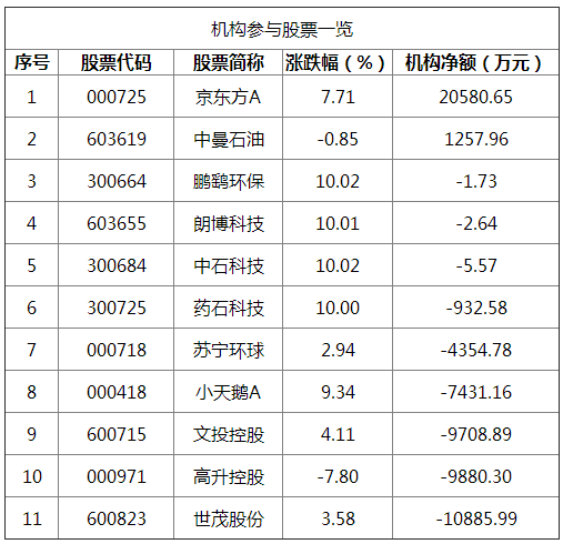 同花順(300033)龍虎榜數(shù)據(jù)顯示,機(jī)構(gòu)今日現(xiàn)身11股,機(jī)構(gòu)專用席位今天凈賣出2.14億元。京東方A、中曼石油(603619)等2股呈現(xiàn)機(jī)構(gòu)凈買入,買入額達(dá)2.18億元;世茂股份(600823)、高升控股(000971)、文投控股(600715)、小天鵝A、蘇寧環(huán)球(000718)、藥石科技(300725)、中石科技(300684)、朗博科技(603655)、鵬鷂環(huán)保(300664)等9股呈現(xiàn)機(jī)構(gòu)凈賣出,賣出額達(dá)4.32億元。