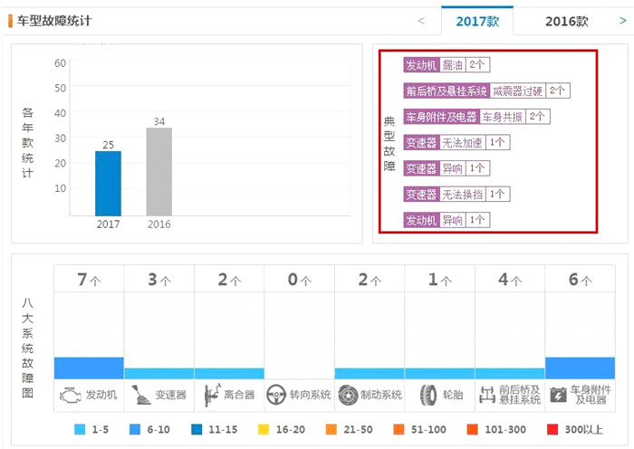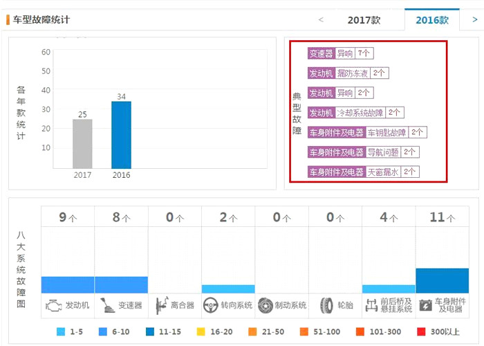 參謀君查找了一下長安CX70的相關故障反映,根據(jù)下圖可以看出,無論是2016款長安CX70,還是2017款長安CX70,大多車主都會反映有發(fā)動機、車身附件及電器等方面的故障。