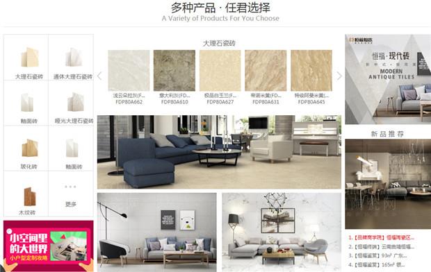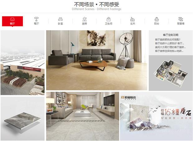 \u00A0 \u00A03.主首頁有最全面、詳細的瓷磚、裝飾信息分類,包括主頁上方的恒福介紹、設(shè)計師在線、曬家分享、全國門店、招商加盟板塊等;還有右上角重點突出的經(jīng)銷商專區(qū)與產(chǎn)品專區(qū);