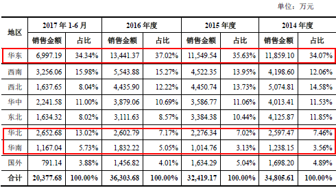 然而,揚(yáng)子地板雖然領(lǐng)先于同行企業(yè),但是其對(duì)房地產(chǎn)行業(yè)的業(yè)態(tài)依賴(lài)也逐漸暴露。如今,面臨房地產(chǎn)監(jiān)管趨嚴(yán)的態(tài)勢(shì),實(shí)木地板行業(yè)估計(jì)也不好過(guò)。特別是對(duì)于揚(yáng)子地板這樣的區(qū)域性銷(xiāo)售商而言,簡(jiǎn)直就是一場(chǎng)災(zāi)難。且看其銷(xiāo)售主要區(qū)域: