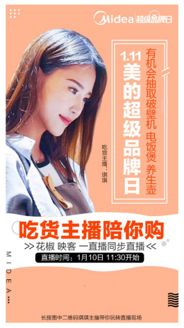 另外,美的還在品牌日前推出了不一樣的H5和創(chuàng)意找茬海報,刷屏了朋友圈,從食、色、味等感官上直戳受眾內(nèi)心,引發(fā)共鳴。1月10日,美的品牌邀請吃貨主播琪琪在花椒、映客、一直播上同步直播分享美食制作心得,直播期間參與互動,還有機會獲得破壁機、電飯煲、養(yǎng)生壺,這些創(chuàng)新的內(nèi)容傳播形式讓美的品牌快速和消費者建立起強關聯(lián),實現(xiàn)消費者對品牌的情感遷移,助力銷售轉化。