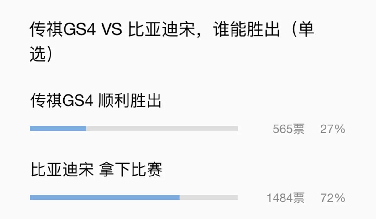 此前磚叔也給大家做了預(yù)告,磚粉們紛紛進(jìn)行了投票競猜,究竟傳祺GS4和比亞迪宋誰更被看好呢?請看大伙的投票結(jié)果: