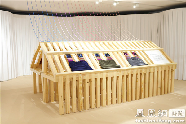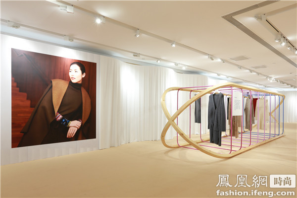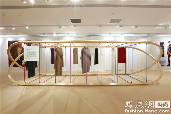 整個展覽設(shè)計圍繞這一主題進(jìn)行了大膽創(chuàng)意,場地融入于不規(guī)則的曲面空間,用現(xiàn)代藝術(shù)手法呈現(xiàn)出羊絨柔軟的材質(zhì)特點(diǎn);同時東西方的織造工具,如紡紗機(jī)、梭子以及制衣吊掛生產(chǎn)線等,被抽象成各類展示藝術(shù)裝置,凸顯現(xiàn)代時尚的展覽氛圍。超現(xiàn)實的空間設(shè)計與優(yōu)雅質(zhì)感的服裝在現(xiàn)場產(chǎn)生碰撞的花火,完美呼應(yīng)出“邂逅東西”這個主題。