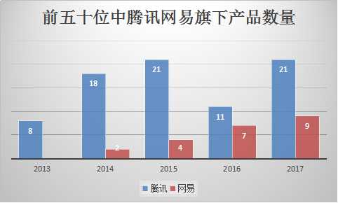 顯然,在中國(guó),固化的不是游戲,而是廠商。筆者觀察了近五年的國(guó)內(nèi)AppStore游戲暢銷榜,網(wǎng)易旗下的上榜產(chǎn)品逐年提高,騰訊雖然在2016年略顯乏力,但整體還是保持了極高的產(chǎn)品數(shù)量——到2017年結(jié)束,榜單前五十位已經(jīng)被騰訊和網(wǎng)易占據(jù)了30個(gè)席位。
