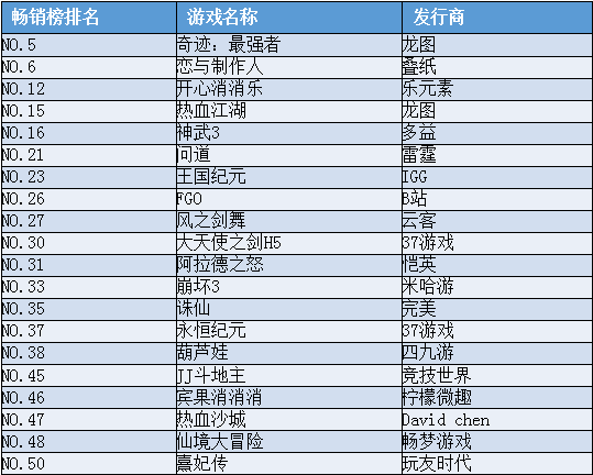 20個(gè)剩余的前50席位,被19家發(fā)行廠商瓜分。除了龍圖,其余廠商都只有一款產(chǎn)品上榜。走精品化路線,集中資源在一款箭頭產(chǎn)品上取得突破,這是筆者第一眼看到這張表格時(shí)產(chǎn)生的思路。