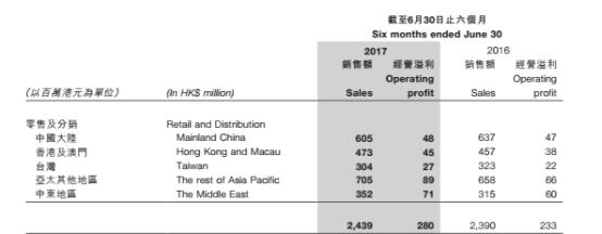 從佐丹奴歷年的業(yè)績表現(xiàn)來看,公司近年來的業(yè)務規(guī)模呈現(xiàn)出逐漸小幅下滑的趨勢,直到2017年中期,公司實現(xiàn)26.18億元的銷售額,同比增長3.4%,經營溢利3.31億元,同比增加24%,總算止住業(yè)績下滑的頹勢。