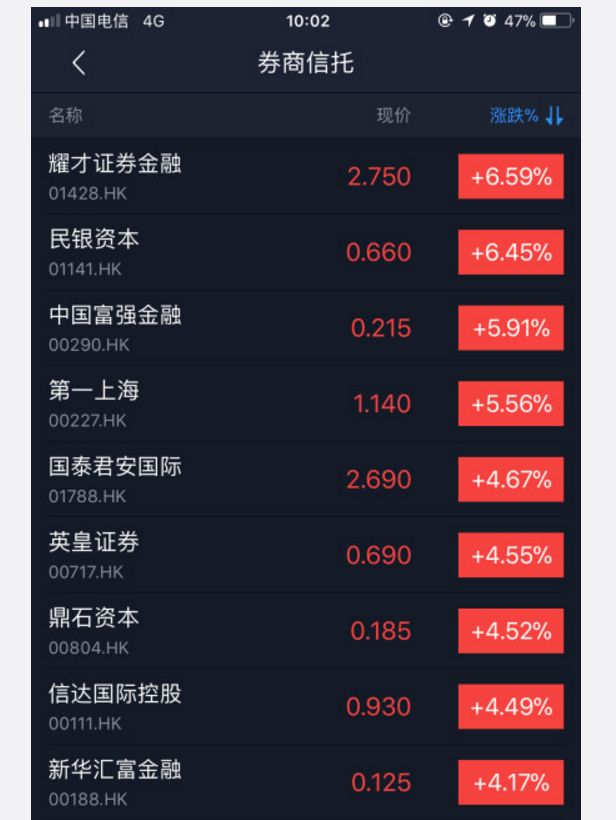 與此同時,港股券商股也聞風大漲,耀才證券金融、民銀資本、中國富強金融、第一上海上漲超過5%,國泰君安國際、英皇證券、鼎石資本、信達國際控股、新華匯富金融等漲幅超過4%。