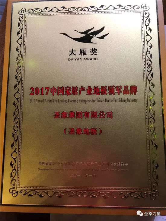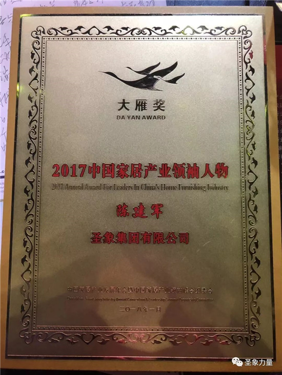 新時(shí)代、新征程、新使命,圣象集團(tuán)總裁陳建軍先生獲2017年”大雁獎”中國家居產(chǎn)業(yè)領(lǐng)袖人物,圣象獲中國家居產(chǎn)業(yè)地板領(lǐng)軍品牌。